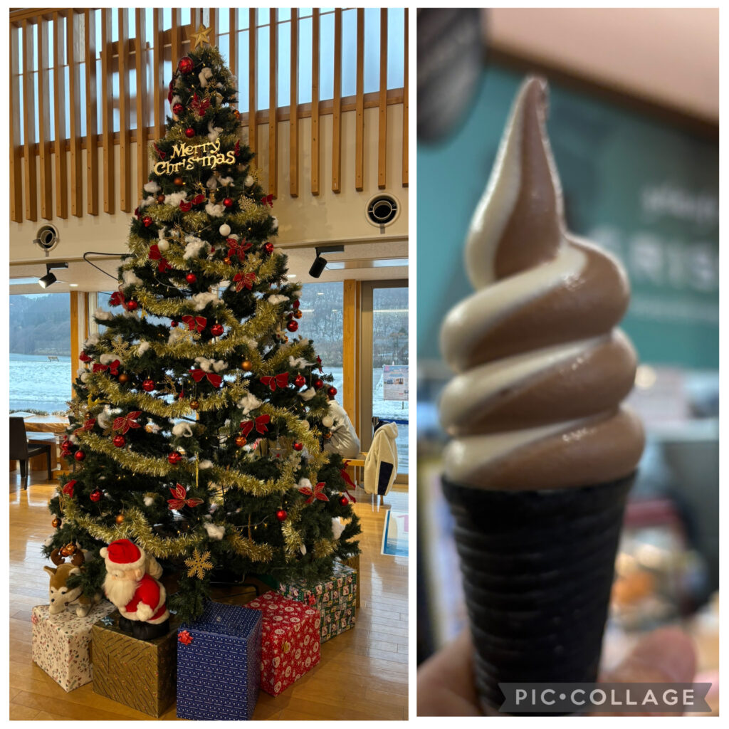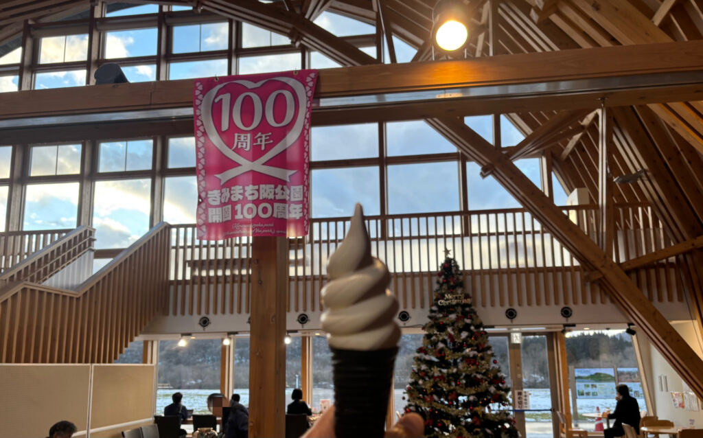クリスマスツリーのおかげか華やかで、米代川が微かに見える大きな窓ガラスに面して落ち着いた木のテーブルも置かれており、お一人様でも気兼ねなくゆったりした気分でソフトクリームや珈琲味わいながら眺めていられます。