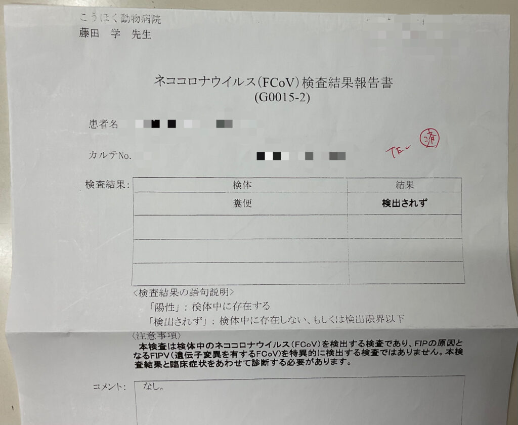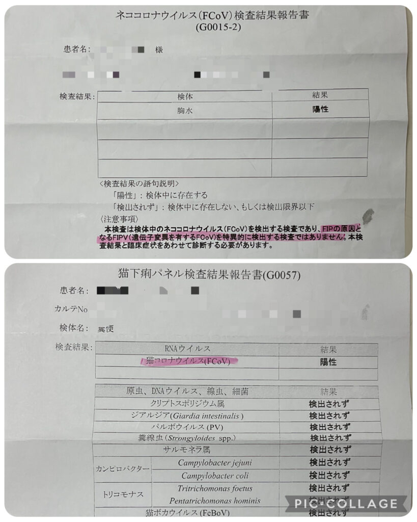 一般に確定診断は非常に難しく、今現在遺伝子検査も含めて100%の診断は困難とされています(後でも触れるけど、誤情報でした💦)。ただしFIPの特異的症状である「腹水」「胸水」等ある場合は、通常複数回の血液検査と症状照らし合わせて診断するのが、吸引した腹水や胸水の一部を検査機関に送る事で一発で診断可能となります。