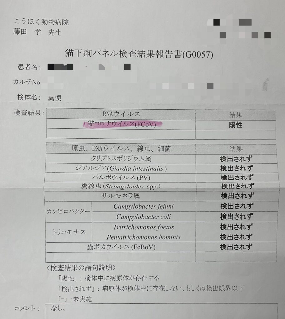 さて実際診断となるとウエットタイプならまだしもドライタイプの場合、今回こちらのPCR検査が陰性だと本当にFIPかどうかはトータル的に症状や経過と照らし合わせながら判断せざるを得ません。